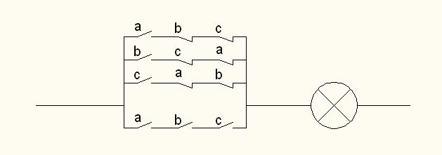 Algumas tarefas são melhor resolvidas na primeira maneira, enquanto outras na segunda. A abordagem intuitiva acaba sendo mais conveniente quando a operação do circuito é controlada por muitos interruptores, mas há alguma simetria no arranjo mútuo desses relés. Veremos que aqui uma abordagem intuitiva leva ao objetivo mais rapidamente, enquanto o uso do aparelho de álgebra de retransmissão no caso de muitas variáveis pode ser muito complicado. É útil se familiarizar com as duas abordagens possíveis para resolver esse problema.